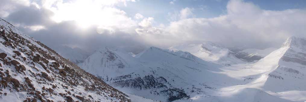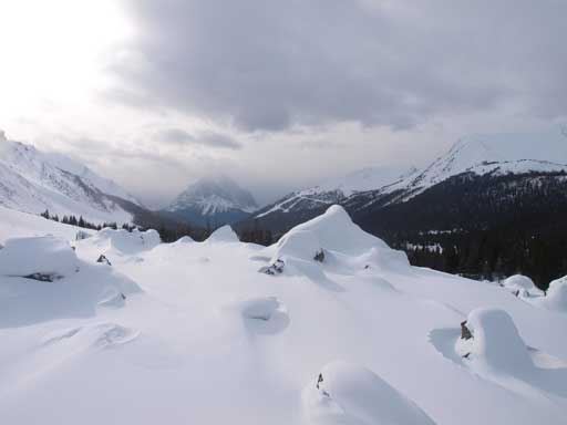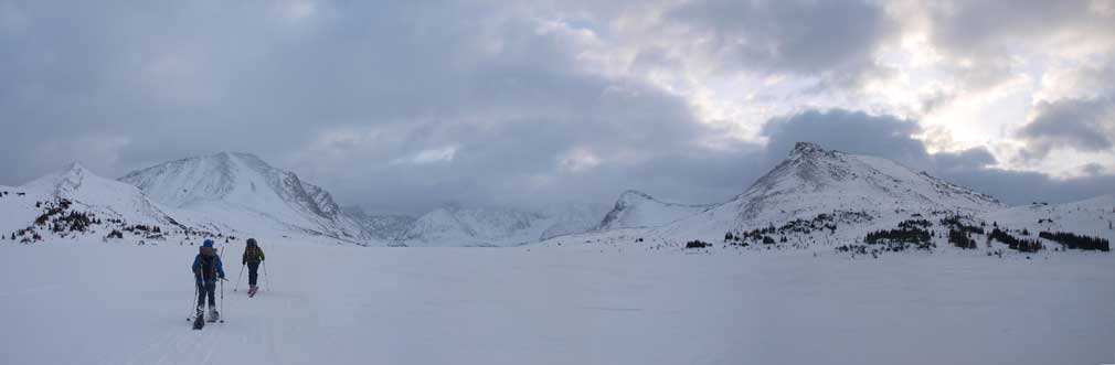 The other side fully opened up once we topped out on the pass. Ptarmigan Lake was frozen and everything was white. Everything looked to be very different from the classic summer view. I think one must go in Skoki in different seasons to fully understand its beauty. The trail across Ptarmigan Lake was well marked, we we were even passed by a snowmobile. Our objective, Fossil Mountain, appeared to be a true slog from this vantage point. In no time we made to the other side and quickly started gaining elevation towards Deception Pass. There was no avalanche hazard what so ever and we started to go up on our own pace.