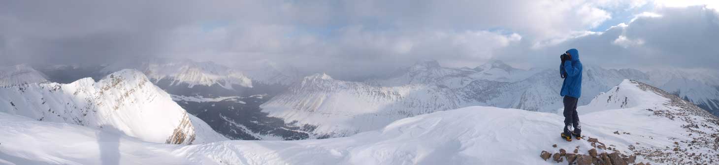 We kept marching towards Boulder Pass on a well marked trail. This trail would eventually go all the way to Skoki Lodge. It’s also apparent that this trail got regularly maintained by the snowmobile traffic. Fossil Mountain is also a peak that can be done even if avalanche condition is high. The approach is as easy as one can expect, and the ridge rarely holds any snow on it. Anyway, we quickly made to Halfway Hut, where Kelly went in for a break. You can always catch the morning light on impressive Mt. Temple if you know where to look back. The slope to Boulder Pass was kinda foreshortened. There’s quite a bit of elevation gain to get there.