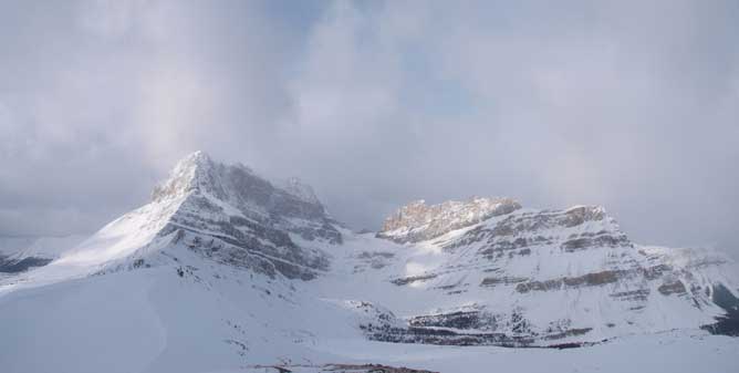 I was joined by Kelly Smith and Ben Nearingburg and three of us left Edmonton Saturday evening, and we all bivyed at the trail-head. There must be stuffs working at night at Lake Louise ski resort, and we could constantly hear the snowmobile sounds. But even that we all got a good sleep. I had done the Skoki approach 3 times, and I knew exactly how boring the initial approach was, so we decided to start in darkness. Your first view would be looking back at Temple, but that’s roughly after 40 min into the trip. So we woke up at 6, and started at 6:40 am.
