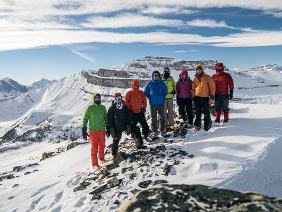 Heather Ridge is a smaller summit in Skoki’s core area that’s missed (or ignored) in Alan Kane’s scramble book. However, after finishing the ascent, I should say it’s certainly worth a visit. All other nearby summits except for Fossil Mountain and Unity Peak are more or less only doable in dry condition, so a winter visit to Heather Ridge would give a totally different experience and views. The gentle slope on its west side grants a safe way up even when avalanche hazard is high. After a dozen changes of plan, Mike and I eventually decided to join Vern and Wietse for a ski ascent of Heather Ridge. And after throwing out the plan, our group grew rapidly to 9 people in total (Andrea, Raff, Sonny, Brandon, Spencer, Vern, Wietse, Mike and myself). With a ridiculous temperature of -28 degrees outside, we all met at the trail-head by 8:50 am. This was my first time meeting Sonny, Brandon and Spencer.