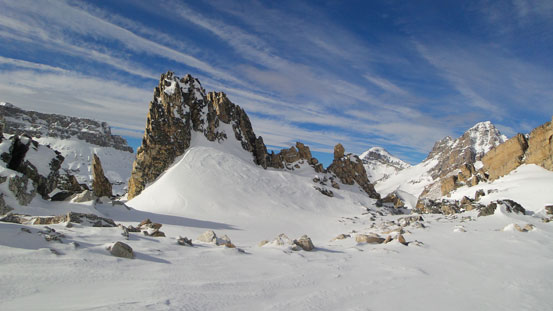 Up and over Boulder Pass, we were welcomed by incredible scenery. Last time I was here in winter was Fossil Mountain trip, but the weather was way worse than this day’s. Down to Ptarmigan Lake, we followed the ski tracks for a short while before deviating more to the right side. We left Ptarmigan Lake at about halfway across, and then we aimed at the broad area between Reboubt Lake and the NW ridge of Heather Ridge. There was a big scree ramp in front of us but based on the photo I took from Unity Peak, we knew that wasn’t the way up so we kept contouring. Now we had multiple choices. We could ditch the skis and start bootpacking up one of the many dry lines, but we decided to keep skinning up and see how far we could go. Good call! We managed to find a snow gully just to the climber’s right of that big scree ramp and managed to follow it all the way to summit ridge. There were a couple tricky spots with lots of rocks but manageable. I found the best scenery came at near the summit ridge. There were many quartz rock pinnacles and they looked impressive in winter. We skin’d all the way to false summit.