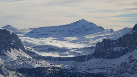 The ski down that snow gully was easier than I thought. We managed to stay skier’s right to avoid most of the rocks. There were a few steep and icy slopes but nothing side-slipping can’t manage. Lower down we decided to ski down a big gully that we spotted earlier. Across Ptarmigan Lake and then up Boulder Pass which was the last major uphill for this trip. We also ran into Sim Galloway’s group at near Temple Lodge. It’s good to run into those Rocky Mountain peak bagger legends. At the mean time Sonny finally showed up. Apparently he’d turned around and he just came out of Temple Lodge. The return was fast and furious and we got back to the parking lot in no time.