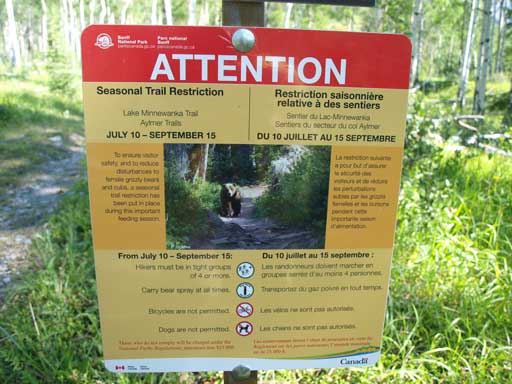 I was yelling during the past 1.5 hours on Lake Minnewanka Trail, and now, I have to yell at a much more frequent pace. Compared with Lake Minnewanka Trail, Aylmer Pass Trail is much more less traveled. Seeing those signs just made me more nervous. Normally if you don’t surprise a bear it won’t attack you (unless it has been fed on human food), so making lots of noise is the best weapon. I yelled about once in every 10-15 seconds. Upon reaching the Aylmer Lookout Junction, I decided to take the faster way up, which is via Aylmer Pass. Yes it’s a faster way, but I soon realized that this trail leads you to a more active grizzly country. Oh well, at least I knew I would be out of the trees in about 40 min, so not too bad.