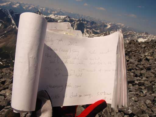 Finally, after 6 hours trudging, I stood on the summit of Mount Aylmer, a peak more than 3100m elvation. The views are awesome as I could look down at most stuff, but mostly unnamed peaks though. The most imposing feature towards east was Devil’s Head in Ghost River area. Towards south I could see Lake Minnewanka with the dual-summit Girouard/Inglismaldie rising behind. The view was a bit smoky. I don’t think that’s because of forest fire, but rather the high humidity of the air. The register was placed in 2005, and there are not so many ascents since then, but I could recognize lots of familiar names.