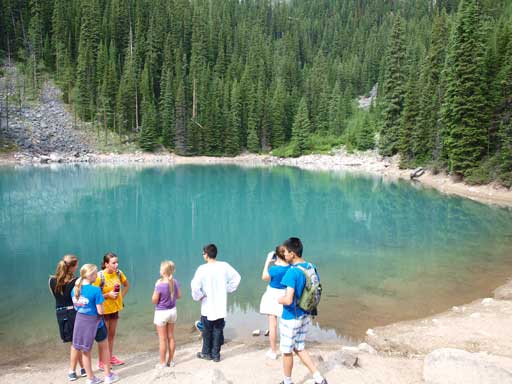 After the heaviest rain passed by, I went out and started down the trail, together with other tourists. I was concerning about another heavy downpour so I made my way down quickly. To my surprise, pieces of blue sky and sunshine started to appear as I got back to Lake Louise. I waited at lake shore for a while and it turned sunny quickly. Since I still had lots of energy, I decided to give Tower of Babel a shot.