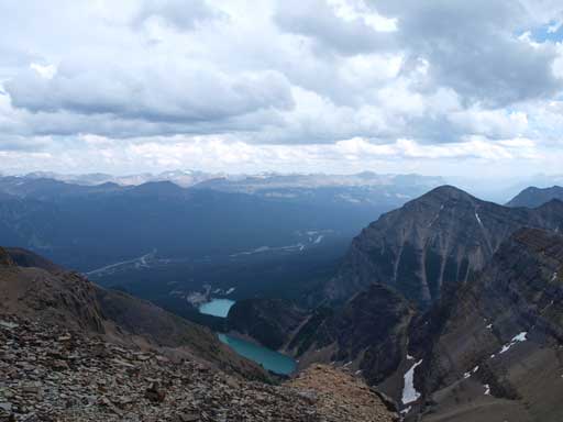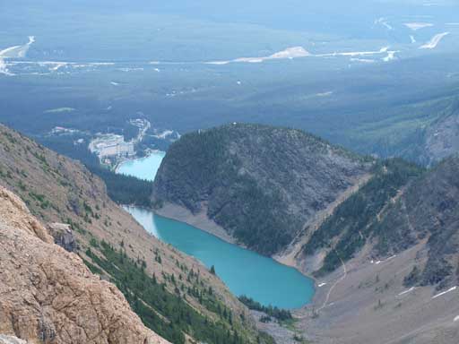 Looking back down to Lake Agnes and Lake Louise. The Beehive at center