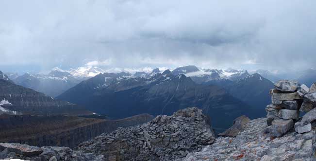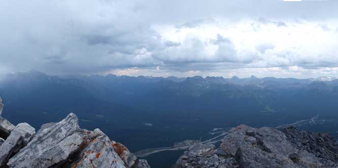 If you can deal with loose scree, then Mount Niblock is pretty much a walk up on well trodden paths, with the exception of first cliff bands (ie. the waterfall). Lots of cairns mark the way through this obstacle, so route-finding isn’t an issue. However, there’re two short sections requiring hands-on scrambling. It’s not a big issue though, and it’s much easier than Mount Temple’s crux, even if wet. Once through the waterfalls, I was in the upper bowl, where lots of snow remained. The terrain was very gentle and the snow actually offered better footing. I went slightly climber’s left to circumvent the next obvious rock band, and then turned sharply climber’s right, following one of the several obvious paths and cairns, towards Mount Niblock. Everytime you lose the trail, you can find a cairn somewhere up. At this point, I started to lose blue sky… The trail eventually led me to Niblock/Whyte col, on Niblock side. Just about to top out on the col, I heard the first thunder, way in the distance in Yoho. I got my first view of the other side once at the col, and man, it was way worse. Yoho was already soaked in.