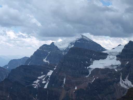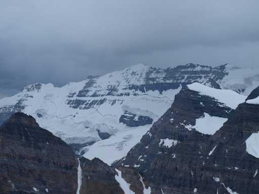 After that I ran down the upper ridge for as quickly as possible. I didn’t even bother to linger at the col, but descended for about 20 meters down the talus slope, where I finally could relax a bit.. Hail started to fall by this time. I briefly looked at Mt. Whyte for a few seconds. In my mind I did not want to leave it behind but on this day I had no choice, as I didn’t want to die on the ridge. After putting on my jacket, I started running down the upper slope.