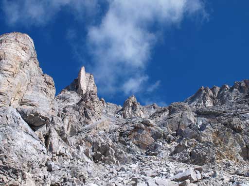 By now we’d already cleared the most difficult bits on our way up, but the terrain ahead was still difficult scrambling. Near the top the terrain became scree covered down-sloping ledges and slabs. We didn’t find this section being too difficult going up, but as most of you know, this type of terrain would require extreme caution on the way back. The big drainage eventually brought up back to the summit ridge at just a few steps before the summit cairn. The views were fantastic from this lofty peak, and we took our time soaking in them, before committing to our descent.