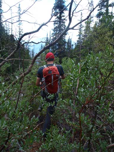 Following the big drainage down wasn’t easy on our knees as it was mostly rubble. There was a brief snow line and I took advantage of it, but that’s it. Despite the fact it looked to be short, I knew exactly how far we had to descend since I’d done the west end. After eternity we made back to the trees and took a longer break there. The walk down this drainage was generally easy, on either boulders or forest with light bushwhacking, but took a long time. By the time we eventually dropped all the way to Goat Creek Trail, we were actually below our starting elevation. Now we had to slog all of the way back, on this wide trail though. The trees blocked most of our views but also blocked the sun. From this trail it was gonna be very difficult to locate the start of our descent drainage, so if you decide to go up this way, you will need a GPS waypoint.
