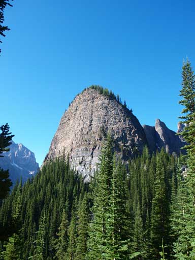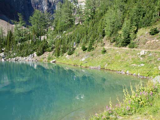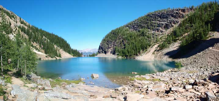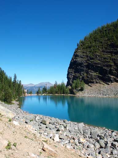 This was my 4th time at Lake Agnes, and the first time getting bluebird sky. I took a short break and started circumventing Lake Agnes. Before venturing onto the boulder field at the west end, I looked for a faint trail going into the trees. I then followed it to the base of the rock pile. Trudging up the rock pile was tedious and tiring but I made to the first rock band in no time.