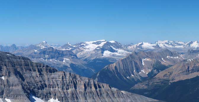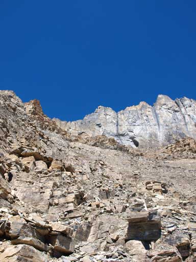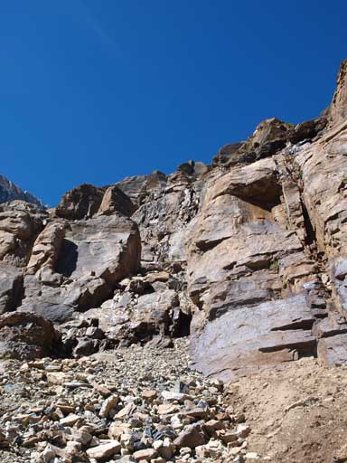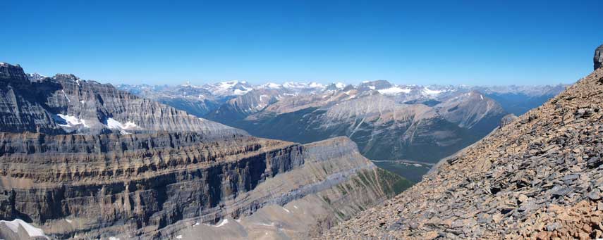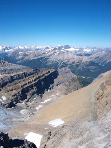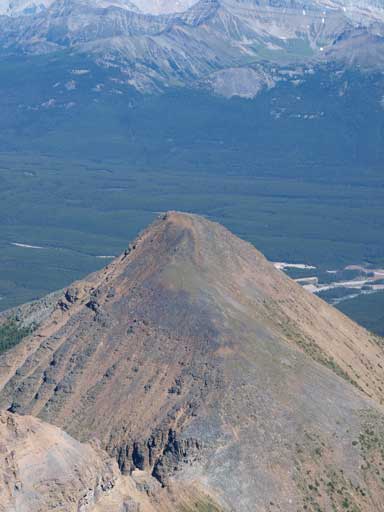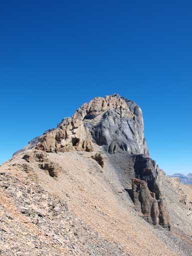 To get to Mt. Whyte, I descended a short distance while following the connecting ridge all the way to the base of the rock cliffs. Here I was blocked by a short wall, but by traversing climber’s right for 10 m I managed to spot a line regaining the ridge. There were some cairns here marking the route. I then stayed on the ridge crest until seeing a beaten path traversing climber’s left horizontally. I followed this path to the obvious loose down-sloping gully that Kane warned not to get into. The gully wasn’t bad and I scrambled up the right hand side on some moderate but loose terrain. The gully led me to a narrow col and then I dropped down the other side. Now I got to traverse on another beaten path for 20 m towards the crux.