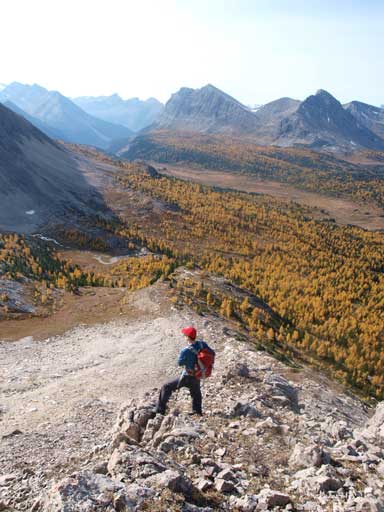 Now back on track. We followed the trail circumventing Fossil Mountain on its SE side, towards Cotton Grass Pass, the divide for Oyster Creek and Baker Creek. By now we were about 15 km from parking lot already. There were more larches waiting for us! At the pass, we left the trail and bushwhacked up directly towards the face of Oyster Peak. I think it’s probably the first time I enjoyed bushwhacking. It’s quite a unique experience to bushwhack in larch forest! At treeline, we were treated by excellent view down to the valley. Fossil Mountain looked impressive from this side. Skoki Mountain was also visible, oh man, that’s a long long way to go.