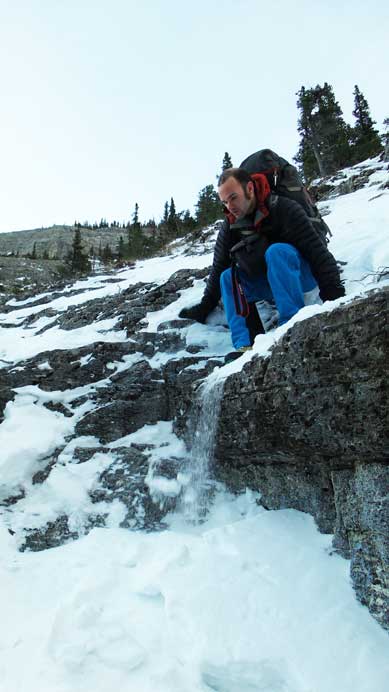 From above the second rock band to treeline was a tedious slog in deep snow. The treeline appeared to be “right there” but the process seemed to drag on forever. Once exiting the trees we had to slog up a pile of frozen scree to the base of the crux rock band. This is a vertical wall guarding the summit block from all directions. Though it doesn’t appear to be major there’s no easy way up. Based on our research we knew the easiest line up was a double-crack system rated at 5.4. It was advertised to be only 5 m but in fact it’s almost 10 m high. Ben and I tried to free climb it firstly but it turned out even trickier than appeared. After some discussion we decided to backtrack and try another gully further climber’s left that Vern noticed. The climbing section in that gully was shorter but more technical. Ben tried it but gave up shortly after, so we were back to the first route.