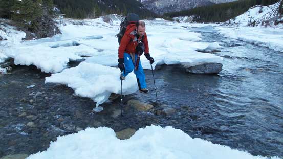 With Vern volunteering to drive his truck we could count on at least making to the top of “big hill”. The road condition turned out better than expected and Vern did a fantastic job negotiating down the “big hill”, crossing the first channel of Ghost River and then following the previous trucks’ tracks for another 2 km or so. We parked just before a large patch of ice and at this point our approach distance was already shaved off to within 1 km. Great.. Wind was not as bad as we expected and not far from the start we were treated with gorgeous sunrise views. Continuing towards our ascending drainage we were surprised to see the main channel of Ghost River still had liquid water flowing… We almost had to wet our feet (that would be awful in January) but thankfully we found a reasonable place to cross.