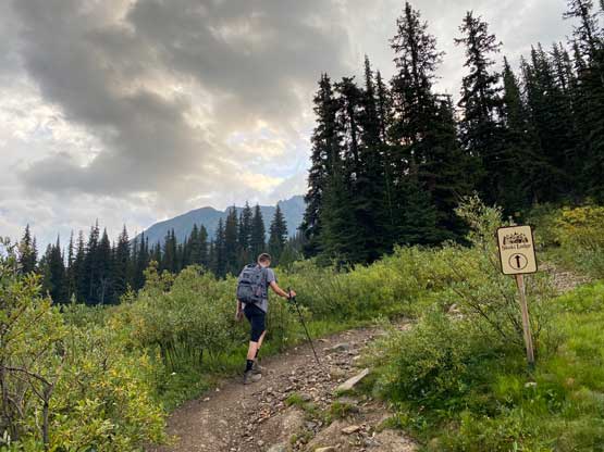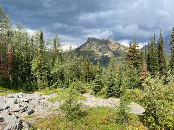 I spent most of the previous day driving the familiar Trans-Canada Highway corridor from the Lower Mainland to Lake Louise. The driving was mostly without event but did feel like a drag near the end. The construction work east of Golden had thankfully been suspended for the Labour Day long weekend so in theory I didn’t have to worry about getting stuck in Golden again. However I’m not someone who trusts the authorities that much and in this particular scenario if they wanted to shut down the road then they could do at any time making any nonsense excuses, so I still planned to drive through that stretch before 10 pm which was the usual night time closure. I stopped in Golden for dinner, drove through the zone at 9:50 pm and slept in my car at Skoki Lodge’s parking lot. There were at least 3 dozens cars parked but I found a spot that’s closest to the trail-head. JP showed up in time but it was raining intermittently. That was not supposed to be the weather based on the forecast but we were committed for the day so we had to embrace it.