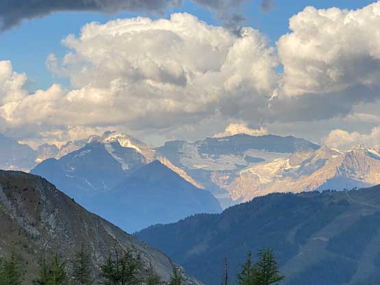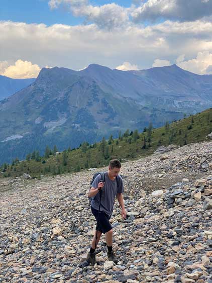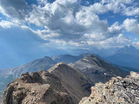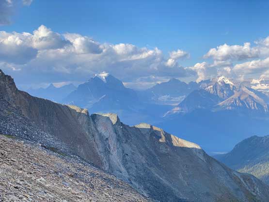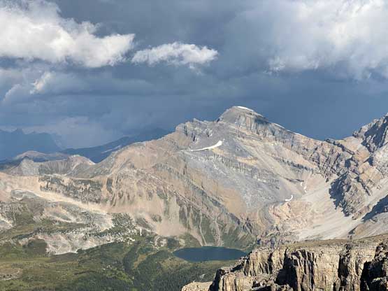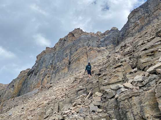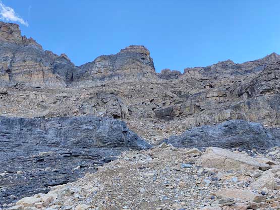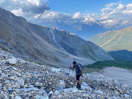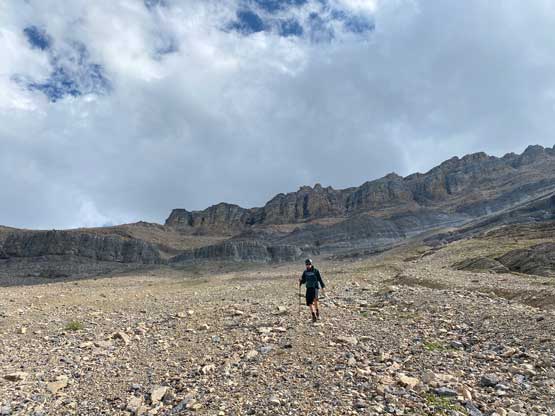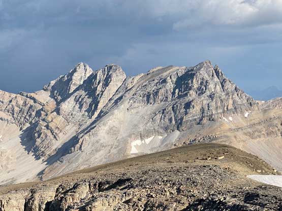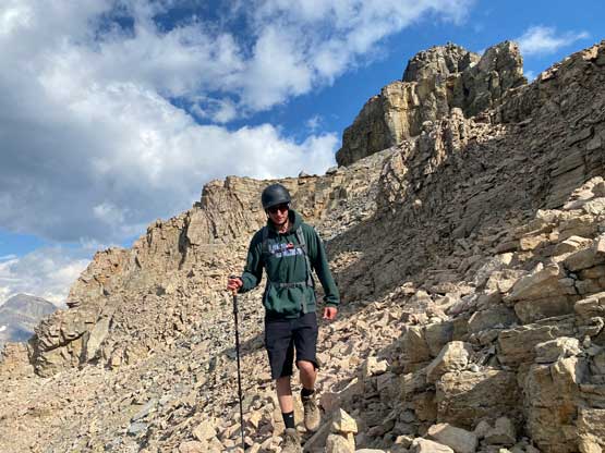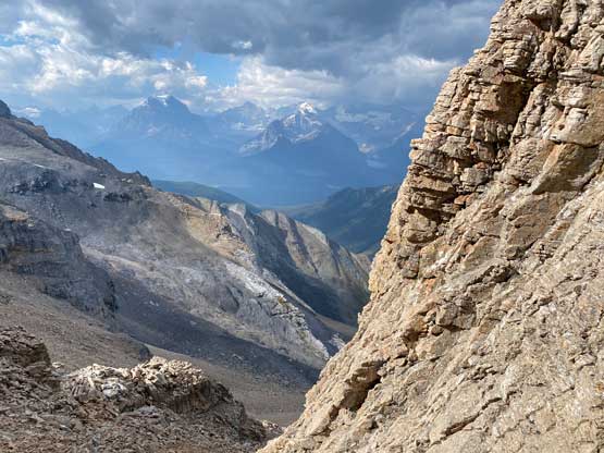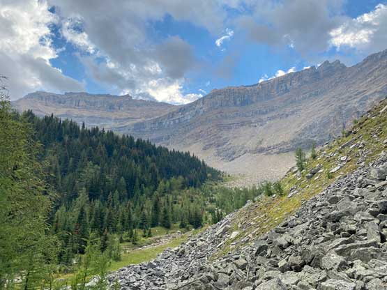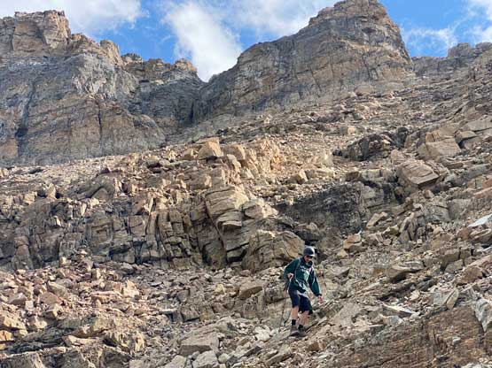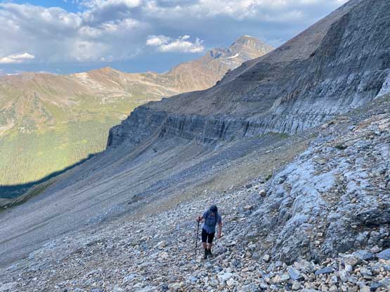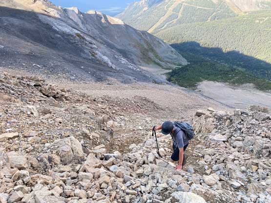 As for all peaks in the Skoki area the ascent started by plodding up the gated access road. It’s a shame that we all had to walk this extra 4 km with about 400 m elevation gain. Once past the ski resort we picked up the trail towards Boulder Pass and this trail was still mostly just an old road. I had read somewhere that the Spirko’s route now had a climber’s trail to facilitate the access and I even had downloaded a GPX file but we couldn’t locate the start of that trail. We tried to find a path on both sides of a creek but to no avail. We actually went up a short ways on the north side of the creek but gave up after encountering some nasty bushwhacking. The solution must be on the south side. We actually found a game trail here and there and the bushwhacking was much more tolerable. The grunt was quite steep at places and we emerged out of the trees under the gigantic SW Face/gully of our objective.