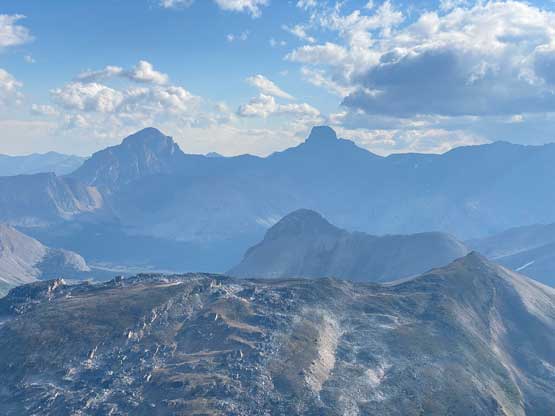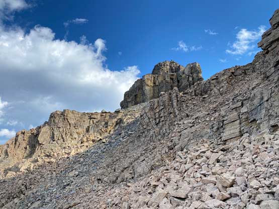 The bushes and the boulders were all wet from the recent rain so we had to be extra careful traversing into the drainage. We followed this drainage (now dry) upwards to treeline. The actual ascent of this peak was easier than appeared but the terrain was loose and tedious. We mostly just trended climber’s right and ascended a long class 2 gully to top out onto or near the summit ridge. The summit block was attacked by traversing a short ways leftwards underneath the guarding cliffs and there’s at least one class 3 step that’s unavoidable.