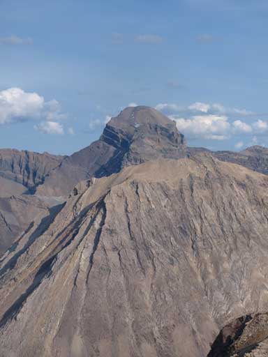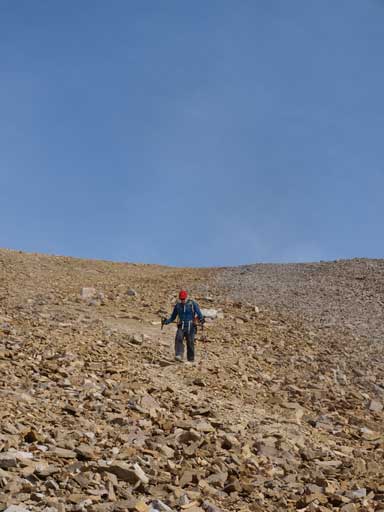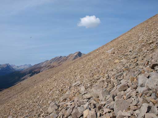 The trail is right at the back of the outhouse. It’s marked and well-maintained. So make sure you find the correct trail up. We gained elevation quickly. At treeline, we could see the rest of the way: a huge scree slope… Well, at least we only had 300 m more elevation to gain. There’s nothing to describe here. The scrambling was very boring but the view was good.