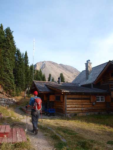 The west face descent of Oyster Peak ended at bushwhacking down to Oyster Creek, where we re-filled our water bottles. The direction to Skoki Mountain was a bit confusing. We failed to reach the correct Jones Pass trail, and ended up too far down towards Red Deer Lakes. We had to do more bushwhacking to regain the proper trail. Jones Pass is less scenic comparing to what we’ve just seen. We quickly moved over the pass without being distracted by the views. There was more elevation loss to get down to Skoki Lodge though, which was very frustrating. We took a short break at the lodge, getting ready to the slog up Skoki Mountain.