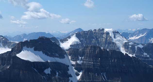 The south side of “The Ten Peaks”. Mount Temple is the big one in shades.