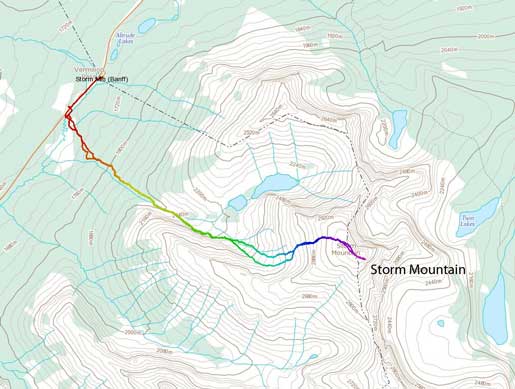 I was quite tired after the long ascent up Fisher Peak in the previous day, so I was looking for a shorter objective. Kevin Papke and I were originally planning on Wapta Mountain, but after realizing how “difficult” that peak is Kevin figured we should do something less (technically) demanding. We re-scheduled it to the following Wednesday (with rope and gears, etc.) and Kevin pointed out the nearby Storm Mountain as we drove up the Bow Valley corridor. Did we pick an easy objective? No!!! It turned out to be the least enjoyable scramble I’ve done in Alan Kane’s Scrambles in the Canadian Rockies so far.. And not to be confused with another officially named Storm Mountain in the Highwood Pass area, this one is on the boundary between Banff and Kootenay National Parks on the continental divide.