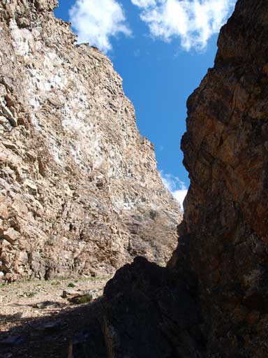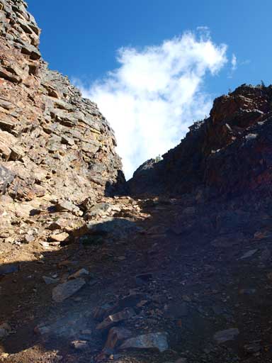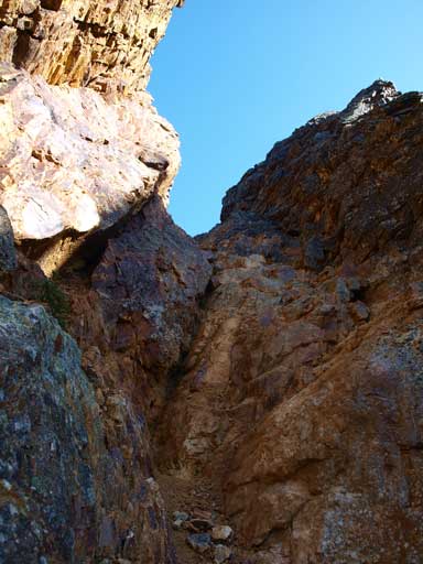 The next thing to do was simply slogging up the gully. The ground was loose but generally okay for ascending. It’s the type of terrain that does not feel annoying for both the ascent and the descent. However, rock fall is a real hazard in this gully, from the steep wall on climber’s left and from scramblers above. Luckily for me there’s no one in front of me. The gully was also foreshortened, so be prepared – pretty much all of the elevation gain will be done in this gully. Near the top the gully narrowed down and became a bit rocky. A few hands-on moves were required, but nothing overly tricky. I would still rate this as “easy” by Kane’s standard.