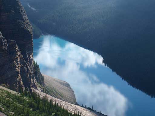 The clouds lifted once I got back to Lake Louise from Mount Niblock. I still had energy and time for another peak. Tower of Babel jumped into my mind. I quickly made my way to Moraine Lake. Probably because of the heavy thunderstorms, some tourists had already left so I could park easily. Usually, it’s hard to find a spot to park in Moraine Lake in a sunny afternoon… Speaking this objective itself, it’s easily the smallest and shortest ascent in Moraine Lake area. It is an interesting tower though as its steep faces boast some of the classic multi-pitch climbing routes in this area. But as a scrambler, the route I took is normally the climber’s descent route via a gigantic gully. From the tourist’s lookout above Moraine Lake I dropped down to the boulder field below, and traverse horizontally towards Tower of Babel. I directly aimed at the ascending gully and did some diagonal side-hilling traverses.