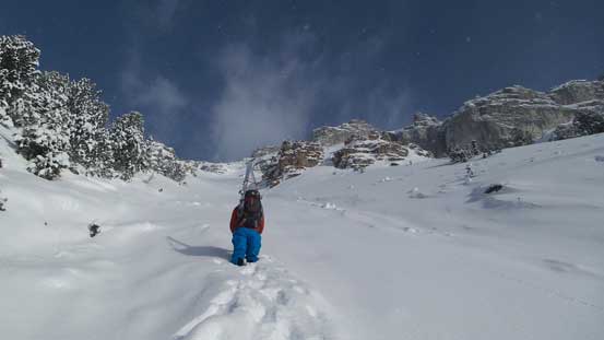 We walked up the debris “staircase” to as far as we could (near treeline) before post-holing in deep snow. This’s about the place where we had to exit the gully on climber’s left. Here’s also when things started to become interesting. The terrain was too steep (35+ degrees) and too crusty for Ben to skin up, but post-holing was waist deep. We certainly did not expect such complex terrain at and just above treeline. Even on my Lightning Ascent snowshoes I had to make some large switchbacks and even that it barely worked. I thought Ben had to fore sure turn around but I’m glad he didn’t. He managed to wallow/swim through a waist deep line to intersect the “scree zone”. I thought about ditching snowshoes once hitting the scree but decided to carry them, and I made a good call. From here to the summit plateau there were numerous rock bands on increasingly steep terrain, and all of them had accumulated deep snow (some areas chest deep). I had to strap my ‘shoes back on for at least 3 times. Tedious, arduous and frustrating, but I was slowly getting there. Ben was also determined to make the summit so he kept wallowing through the waist-to-chest deep snow, grabbing whatever he could to pull himself up against gravity…