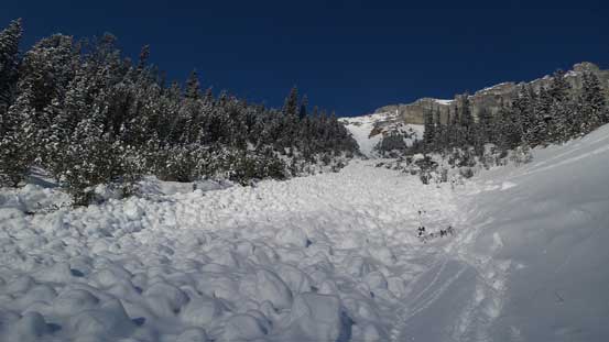 The descent was much faster since the gravity was on our side this time, assisting us wallowing down the snow. It didn’t take us too long to get back to where Ben ditched his skis. I strapped my ‘shoes on, but immediately realized the steep trees would be impossible to simply plunge down given the current condition. It was kinda like on Grizzly Mountain last year, the base was too hard, the terrain was too steep and the top layer was too shallow making snowshoeing very slippery. Of course the avi debris and the steep bush would be awful for Ben too. My solution was getting into the main gully, switching snowshoes to crampons and walking down the gully entire way.
