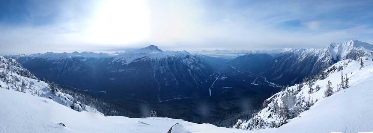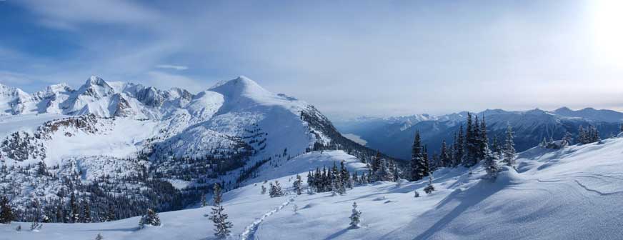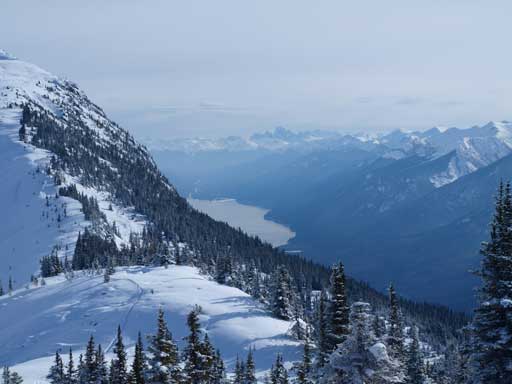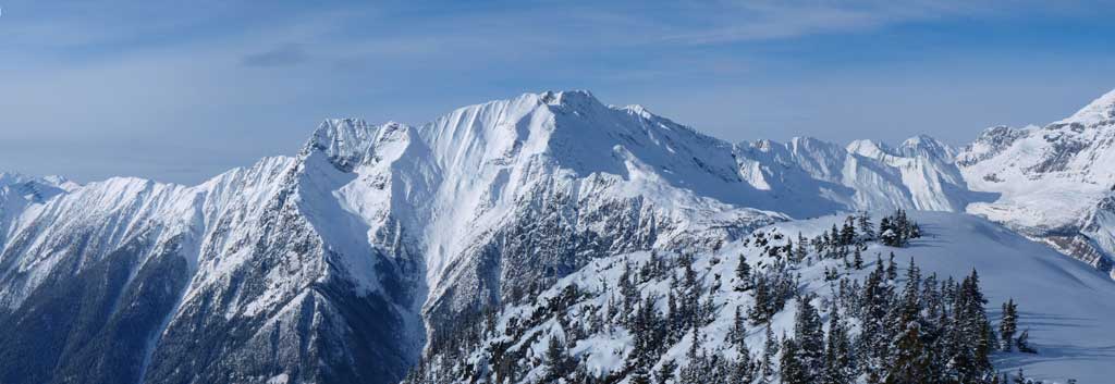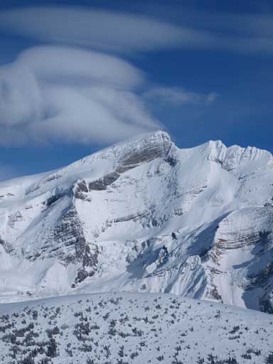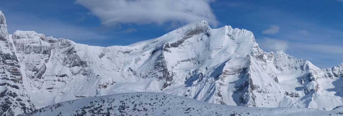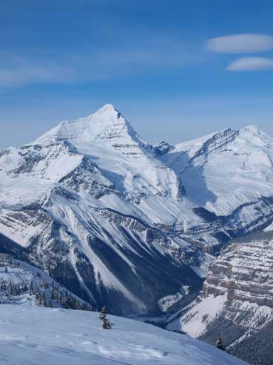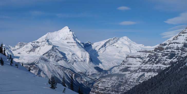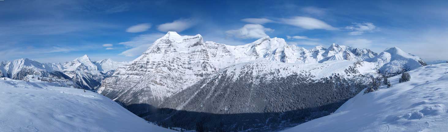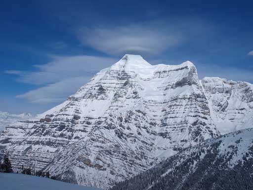 It was all about perseverance: just going uphill. After what seemed like eternity, the snow got knee deep and the forest started to get thinner. Time to change to snowshoes. More post-holing on snowshoes, I eventually topped out on the ridge. WOW!! This could be the best viewpoint for Robson/Resplendent’s south face! I followed the scenic ridge crest towards the summit. It was longer than expected though. There’re actually a few trees on the summit.