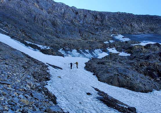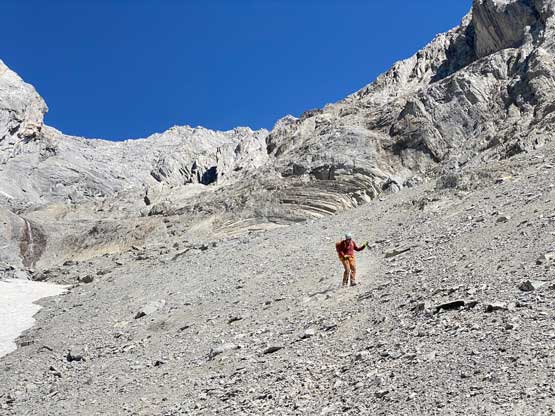 We all loaded up the water bottles while drinking as much as we could at this upper (better) source of water and then there came the “waterfall step”. This would become trivial after what we just did on the upper mountain, but I still opted to switch footwear back to rock shoes. Carl tried to down-climb in boots but immediately called to switch footwear as well. The climb again, turned out harder than expected but Noah used more “crab walking” techniques and made it look rather easy. We then switched the footwear back to the boots. I tried to boot-ski the lower field of snow but this one was icier. After a few turns I gave us, merged back to the scree and descended together with Noah and Carl. The scree here was not as fun as expected as the texture was more moraine than treadmill. The next challenge was to 50 m re-ascent back across the ledge, which was not difficult but tiring. Nearing the end of this traverse I started to side-hill a bit too soon (as I didn’t want to do that extra final 10 m of regain) but this dumped us back onto the exposed ridge variation that we just climbed earlier in the day. We then gingerly down-climbed this long stretch of 4th class and exposed terrain as none of us wanted to backtrack anymore. After the down-climb we linked up several gullies and nearing the bottom I led us veering more on skier’s right in order to stay on the “easier variation” and I think we succeeded on this micro-mission. The terrain was definitely not pleasant, but not as hard as the variation we took on the ascent.