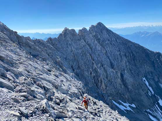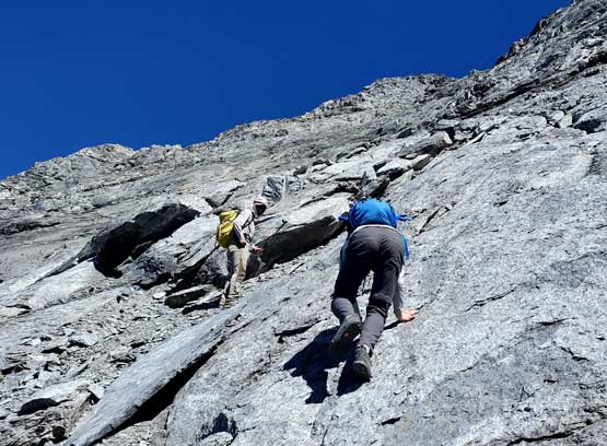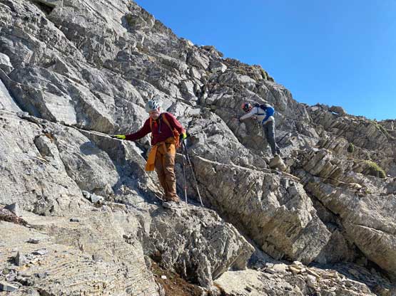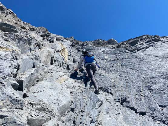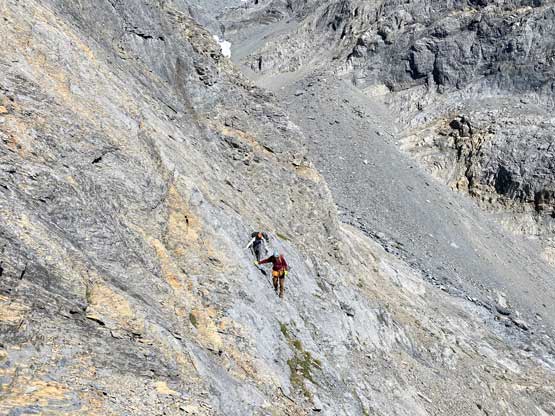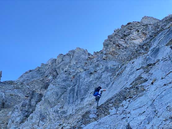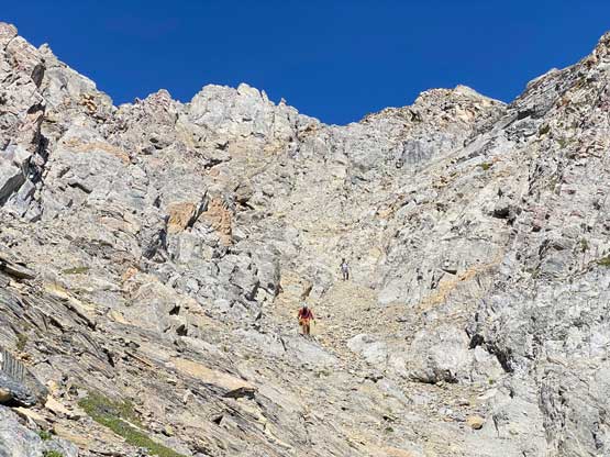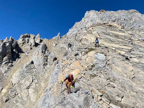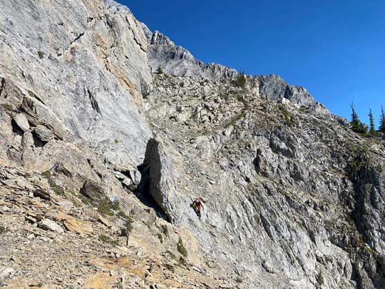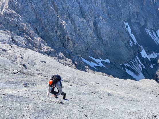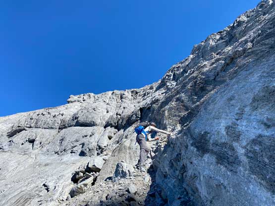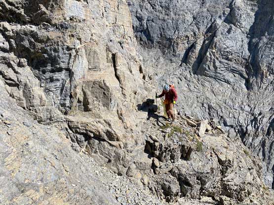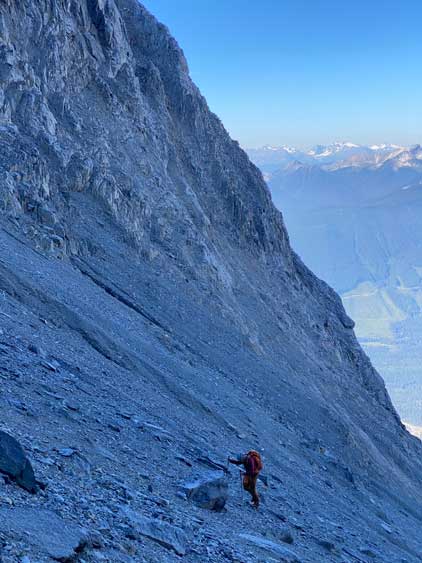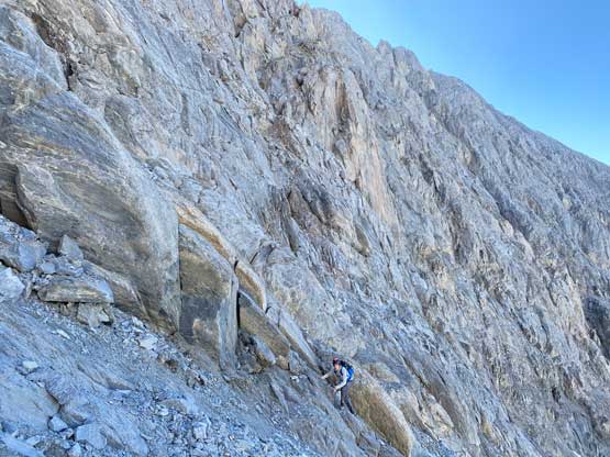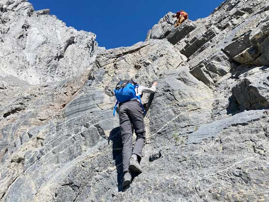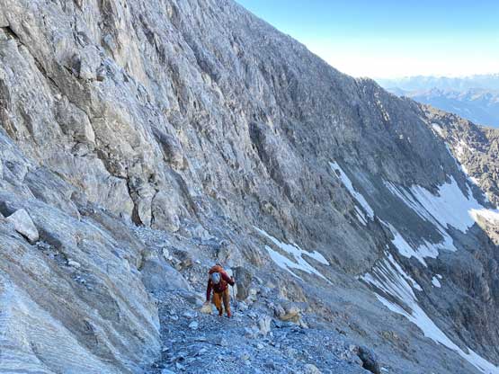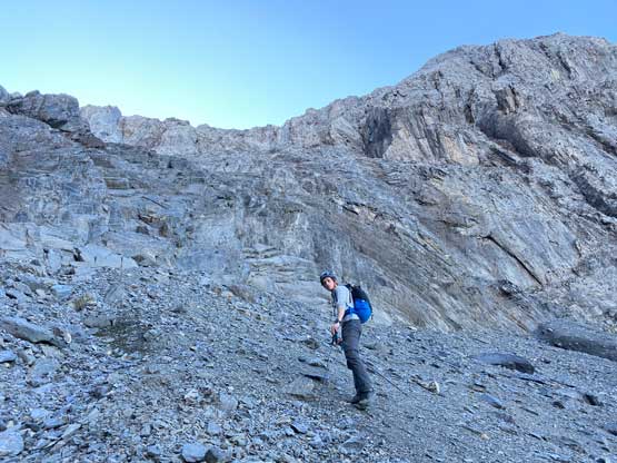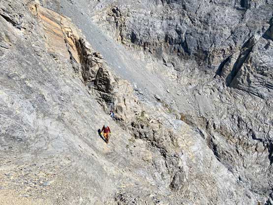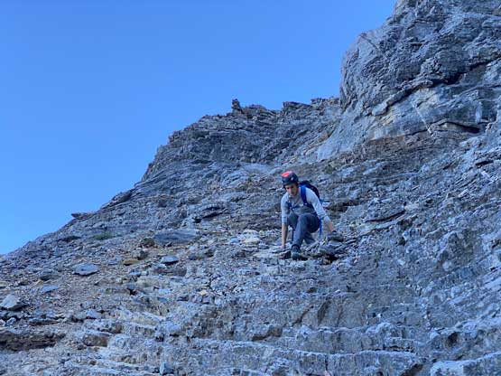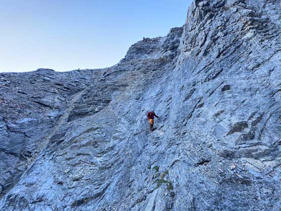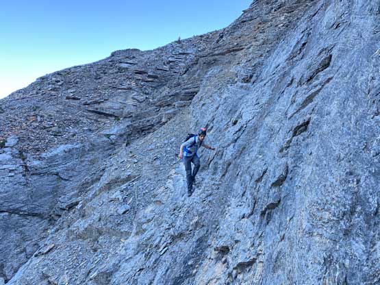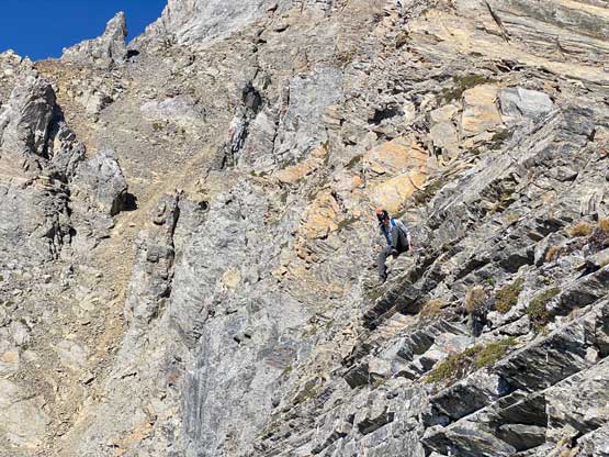 All three of us stored one of the trekking poles and carried the other to facilitate the scrambling terrain ahead. While traversing leftwards under the base of the cliffs I immediately located the “harder start” which did not look hard enough. I opted to check out the “easier variation” farther to the left but didn’t want to deal with more side-hilling, so we all climbed the 4th class “harder variation” which was quite fun. We then followed paths and cairns traversing a few ledges back towards climber’s right and crossed/ascended a few gullies. The scrambling was mostly 3rd class or less, but there were options to make it harder which at least Noah did. I am not a big fan of plodding upwards on treadmill scree neither so eventually all three of us opted for some stiffer terrain on either side of these gullies. The route-finding was rather easy with the GPS track overlay on both topo map and satellite images, and the cairns/path as well as our experience. For the uppermost gully in this zone we followed Noah’s lead ascending to an exposed ridge on climber’s right. The plan was to descend the gully later on the return, but we somehow ended up down-climbing this exposed ridge as well, but more on that later. After this ridge variation we were at the infamous downwards traverse into the main gully (more like a valley), the supposed crux #1. Again, with cairns the route-finding was straightforward. We down-scrambled a loose section and then walked across the most exposed parts of the ledge, which was easier than looked. The annoying part of this section was about 50 m elevation loss which must be regained later in the day.