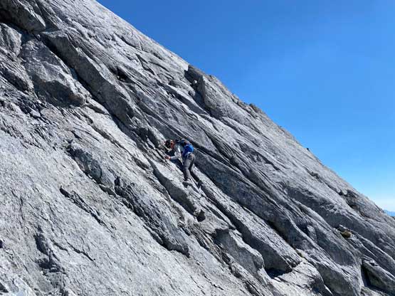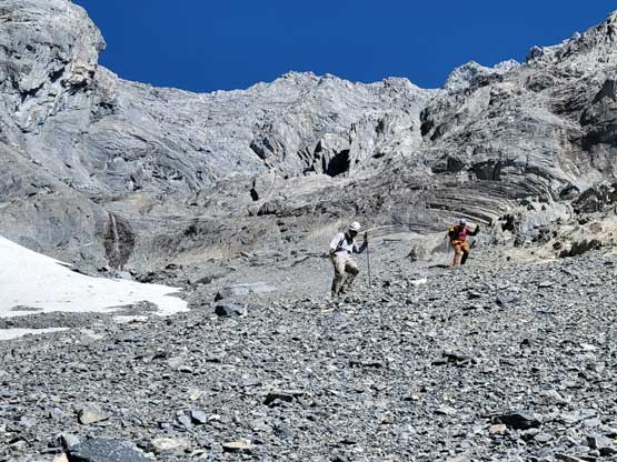 We then scrambled up more “moderate” terrain climber’s right of the main valley encountering more sources of water at higher flow rates. We then all merged onto the upper snow field. I led the way kicking some steps and the upper field of snow started to become quite steep. Carl merged climber’s left out of the snow and scrambled up some loose terrain and we re-grouped at the base of the “upper route” where we took another long break. We finally got our first taste of sun beams here but I could not say we were stoked about that, as this meant a long and hot ass day ahead. I think we did the route-finding on the lower half of the “upper route” pretty well by firstly traversing climber’s left and then ascending up through gullies and ledges. There’s one key ledge (not very obvious) marked with a cairn that we used to traverse leftwards where the more logical way would be to keep ascending to the right. This correct decision saved us some time as this key ledge above a cliff successfully brought us to the second half of the “upper route” where we slowly merged ourselves into a maze of slabs. This was where things became tricky.