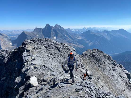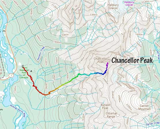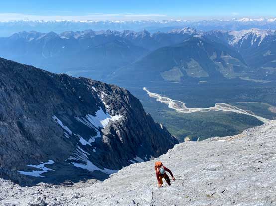 Fast forward to 2022 the trip started out with Mt. Stephen with Oakley on Wednesday but the weather forecast showed bomber conditions on both Wednesday and Thursday. I started to wonder maybe I would have enough energy to pull off Chancellor Peak as well, even though I knew doing two big days (2000m + 2300m elevation gain) back to back might not sound smart, but the weather window was here and I must take advantage of that. I recalled that during my Lunette Peak’s climb in 2020 Noah MacDonald talked to me a few times about doing Chancellor Peak so I sent him a message. Meanwhile I asked my friend Doug Lutz who is literally the central of Rockies scrambling community to recommend one or two top-notch Rockies scramblers and his first response was Carl Glaser. I had never hiked anything with Carl but I trusted Doug’s judgement, so I sent Carl an invite as well. To a bit of my surprise both of them were instantly “in” even though I sent the invites only a mere day ahead at the very last minute. The plan was then quickly formed to start at Hoodoo Creek campground at 6 am. Carl and Noah would carpool out of Calgary early in the morning while I would simply sleep in the car at the trail-head. I was quite excited about this trip as part of me wanted to compare Chancellor Peak with South Goodsir, the sketchiest 11,000er considered by most list finishers. I had a hypothesis that South Goodsir is just plainly dangerous but actually not too far beyond these scramblers’ scope of experience but to prove this hypothesis I must climb Chancellor and/or Robertson. Among these two I felt more excited about Chancellor Peak as this is overall a much-bigger mountain with a more iconic profile.