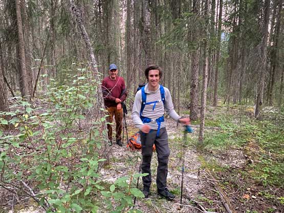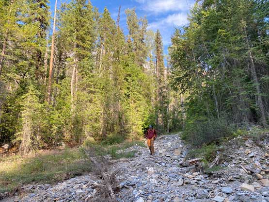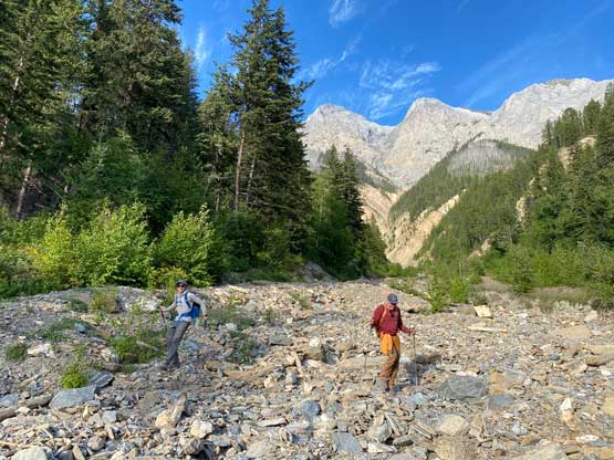 The previous evening I drove to Canmore after Mt. Stephen to properly prepare for Chancellor Peak’s climb. I could have driven back to Golden which was much closer, but I didn’t want to risk getting stuck at the highway closure again, and Canmore is the nearest town on the other direction that I felt comfortable with. I bought about 40 dollars worth of food and drink from Safeway (three bottles of Gatorade, three sandwiches, a bag of cheese with sausages and bunch of others), quickly repacked and drove back into Yoho. I made to Hoodoo campground at almost 11 pm and parked right in front of a locked gate. I had Anton’s GPS track and this parking spot was right on the track. There’s no cell reception and a few confusing side roads but I sent both of them the track so they should have no problem finding here. I opted to wear mountaineering boots while carrying rock shoes for the slabs near the summit and the rock shoes turned out to be essential for the mission. Noah was comfortable wearing approach shoes for the whole trip while Carl would do similar with me, but carrying approach shoes instead of rock shoes. The others showed up at 5:45 am and we managed to start at 6 am exactly as planned. This was right around the time when head-lamps were no longer needed.