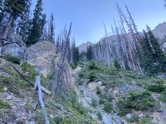 Anton had done a great job putting together a track that’s relatively free of bush but the track diverged on at least two occasions. I had asked him which branch of the track to recommend and he showed me the better way. With his beta we were able to nail this approach with under 10 minutes of bushwhacking overall. The plod across the clear-cut and then the swamp was definitely not aesthetic but I wouldn’t call that as “bushwhacking”. We just had to hop over some dead-falls that were no more than thigh high, and the swamp was not nearly as wet as we expected. There’s even a pretty well-defined path through the swamp. My pants were soaked from the dew but all of our boots were still dry after that section. On the far side of the swamp we briefly thrashed through a dense band of bush and then entered the open forest. Again, there were some dead-falls but nothing really annoying. We followed Anton’s descent track to the very bottom of a large drainage and easily rock-hopped up this drainage for a while. Once making sense we ascended a very steep and loose forested slope on climber’s left to escape the drainage onto a timbered ridge as we knew the earlier we could do this transition the better. We then instantly found the “animal trail that avoids 98% of the sticks” on this timbered ridge as mentioned in some other trip reports and indeed, we didn’t really have to deal with pick-up-sticks until the very end of this stretch, at least 600m higher up. The upper end of this ridge had some unavoidable dead-falls but like I said, the unpleasantness was no more than 10 minutes and that’s it. We then located a bush-free gully and grunted all the way to the base of the rock face ahead which marks the end of the approach and the start of the scramble. About 1000 m elevation had been dispatched by this point and we were under 2.5 hours into the trip.