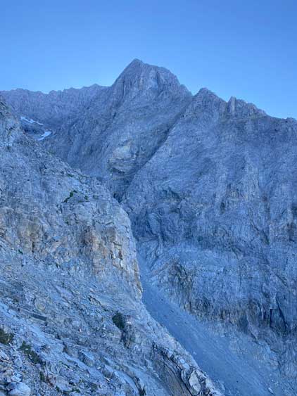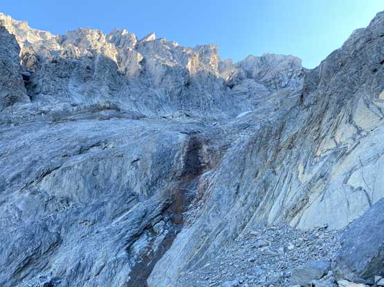 There’s a trickle of streams not far up from where we dropped into this main gully/valley so we loaded up the water bottles. I was not 100% about water sources higher up but in retrospect there were a much better source of water higher up, but we didn’t want to take a chance. We then took out the second poles and plodded up some scree and rubble to the first path of snow. Carl continued ascending the scree while Noah followed my lead ascending snow. I was the only one wearing mountaineering boots so snow was definitely my preference over scree. And then there came the “waterfall step” which would be the crux #2. Noah climbed a line closer to the water while Carl and I scrambled the most obvious break which turned out harder than expected. I was thinking maybe I would want the rock shoes for the down-climb later in the day but either way we all made our respective lines and both Noah and I would call this step “low class 5”. Mine could be 4th class if one really trusts the friction on this water-worn slabs. I couldn’t trust the friction that much, so did some harder moves. And for some of you wanting to bring a rope, there was no rappelling station above this step.