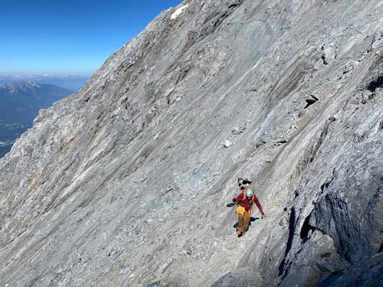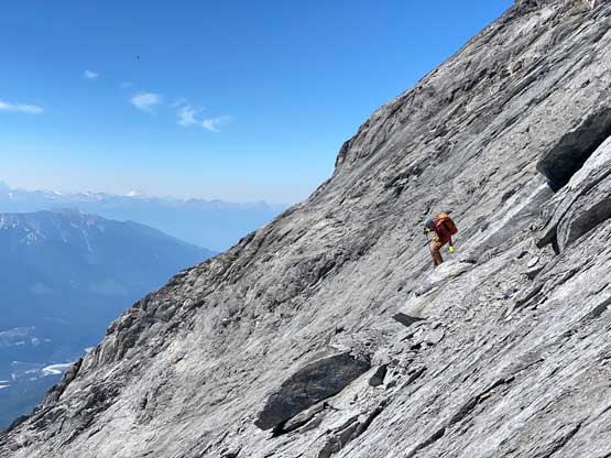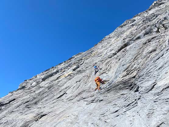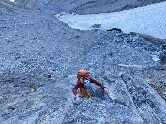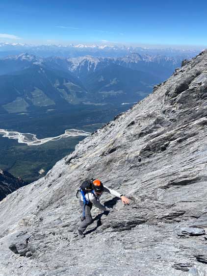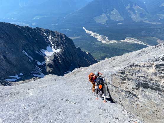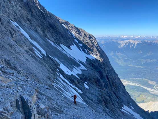 Despite the route-finding errors we opted to take our time on the summit as we were still doing great on time (as we nailed the route-finding on the entire lower mountain). I also enjoy reading registers that illustrate the who-is-who of a local community and this peak’s is certainly one. Eventually after 40 minutes on the summit we decided to face the descent. I was not too concerned as I was sure that one way or another we could make it down. I ended up being too optimistic again.. Pretty soon we came to that slab section and my first theory was to stay higher (more skier’s left) but quickly abandoned the idea after seeing a blank section of slabs. In retrospect that might have been the best way but I could not tell while looking at the slabs. Instead, we down-climbed the line we took to below the sketchy spot in hope to traverse underneath that section. After a committing stretch of down-climbing what we saw was nothing, but smooth slabs. Carl ended up balancing across without any issue but Noah soon turned back to follow me, ascending at least a full pitch of 4th class slabs back up to the level of that aforementioned blank section and then down towards skier’s right we finally noticed one stretch of slabs that were more broken. We immediately committed to that and sure enough it was only 4th class. We should have down-climbed to exactly where Carl was waiting but instead, we traversed skier’s left a bit too soon and that became the second error we made on the descent. To correct this error Noah and I both down-climbed some sketchy 5.4 terrain but after that we thankfully had no more problems. At the bottom of the slabs Carl and I had to take another break to switch footwear back to boots and then I led us down-climbing the snow slopes back into the main valley. I did some boot-skiing lower down as I had stiffer mountaineering boots.