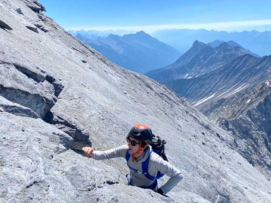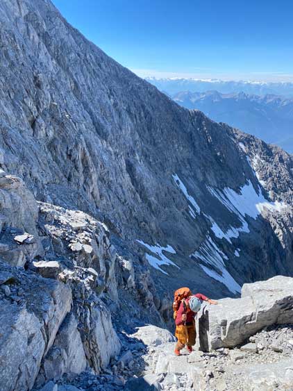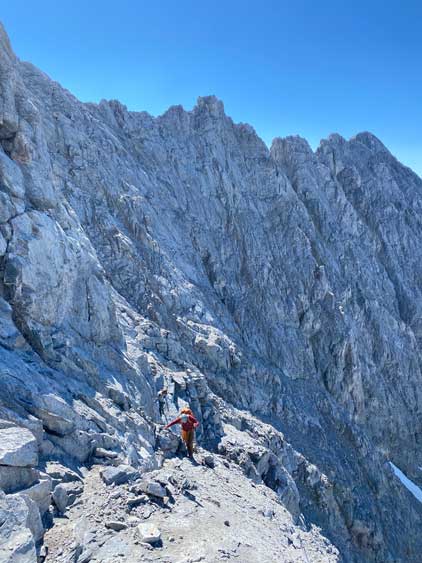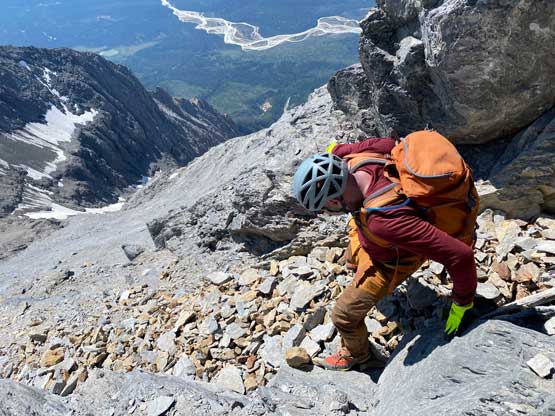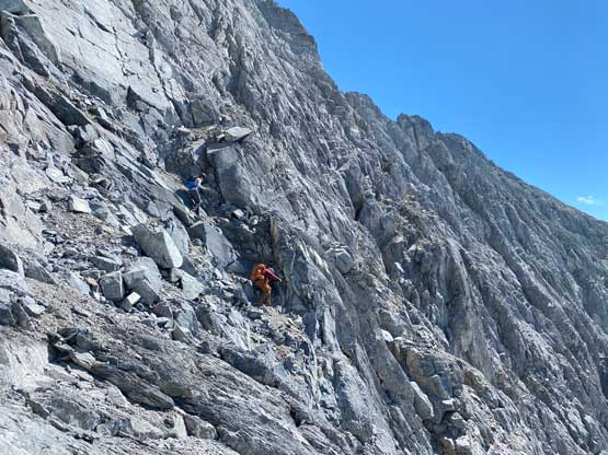 I had some beta that “climber’s right is harder” so we traversed across a few smooth slabs towards left instead, but later at home I also realized that some gorups actually went up and right to hit the ridge and that route didn’t seem to go too terribly. The line we took by staying low on climber’s left was the next level. At one point a cliff band forced us to ascending straight up and that quickly dumped us into 5th class terrain. We should have turned around to find an easier path, but we were being stubborn. I made the call to do a sketchy transition from boots to rock shoes and then led up a 5th class move and then we were committed to this line. But nearing the end it started to become really sketchy with nothing to hold onto. Noah and Carl climbed a pitch of slab corner that Noah rated “mid class 5” with a few irreversible moves to start with. I saw the lethal exposure of this whole section and couldn’t commit. Instead, after wasting at least 20 minutes trying to figure out another sequence I gave up, gingerly down-climbed the class 5 slabs that we just did, and climbed around farther to the left side on more low 5th terrain. The three of us then had to descend a bit to work around another band of rock before joining the two strips of orange rocks mentioned in the other trip reports. At least an hour was wasted here and we also must find a different, down-climbable route an hour or two later and that started to become a bit stressful. The rest of the ascent was not hard anymore, but still loose and exposed.