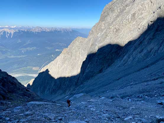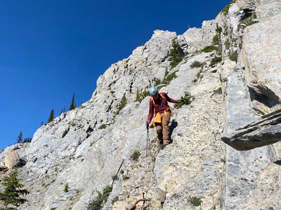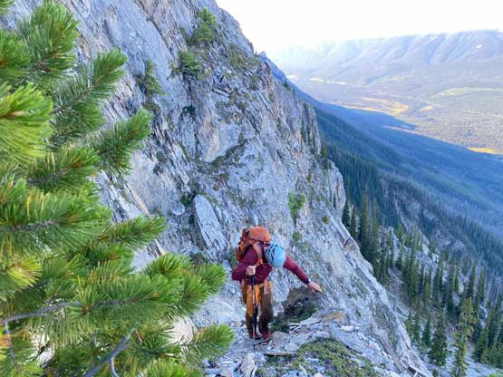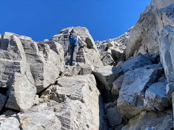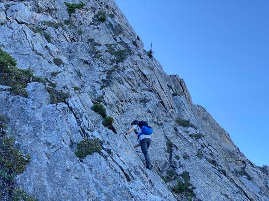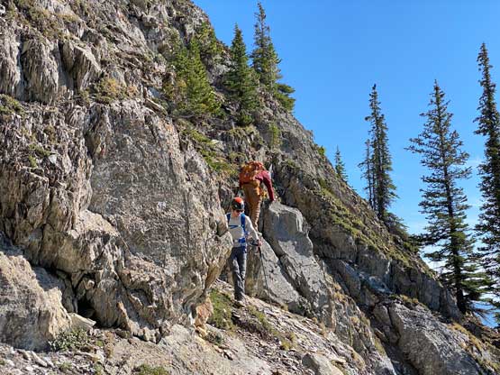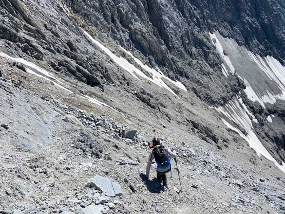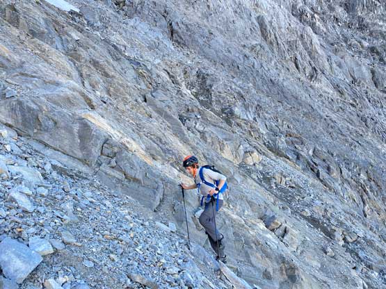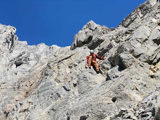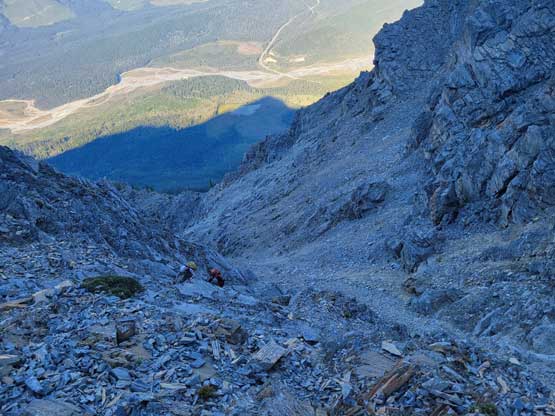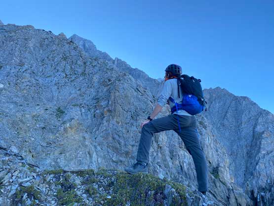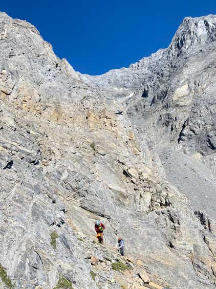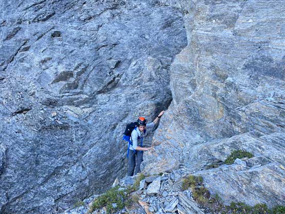 All three of us stored one of the trekking poles and carried the other to facilitate the scrambling terrain ahead. While traversing leftwards under the base of the cliffs I immediately located the “harder start” which did not look hard enough. I opted to check out the “easier variation” farther to the left but didn’t want to deal with more side-hilling, so we all climbed the 4th class “harder variation” which was quite fun. We then followed paths and cairns traversing a few ledges back towards climber’s right and crossed/ascended a few gullies. The scrambling was mostly 3rd class or less, but there were options to make it harder which at least Noah did. I am not a big fan of plodding upwards on treadmill scree neither so eventually all three of us opted for some stiffer terrain on either side of these gullies. The route-finding was rather easy with the GPS track overlay on both topo map and satellite images, and the cairns/path as well as our experience. For the uppermost gully in this zone we followed Noah’s lead ascending to an exposed ridge on climber’s right. The plan was to descend the gully later on the return, but we somehow ended up down-climbing this exposed ridge as well, but more on that later. After this ridge variation we were at the infamous downwards traverse into the main gully (more like a valley), the supposed crux #1. Again, with cairns the route-finding was straightforward. We down-scrambled a loose section and then walked across the most exposed parts of the ledge, which was easier than looked. The annoying part of this section was about 50 m elevation loss which must be regained later in the day.
