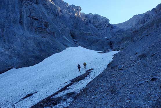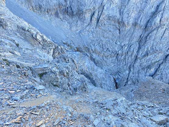 We all loaded up the water bottles while drinking as much as we could at this upper (better) source of water and then there came the “waterfall step”. This would become trivial after what we just did on the upper mountain, but I still opted to switch footwear back to rock shoes. Carl tried to down-climb in boots but immediately called to switch footwear as well. The climb again, turned out harder than expected but Noah used more “crab walking” techniques and made it look rather easy. We then switched the footwear back to the boots. I tried to boot-ski the lower field of snow but this one was icier. After a few turns I gave us, merged back to the scree and descended together with Noah and Carl. The scree here was not as fun as expected as the texture was more moraine than treadmill. The next challenge was to 50 m re-ascent back across the ledge, which was not difficult but tiring. Nearing the end of this traverse I started to side-hill a bit too soon (as I didn’t want to do that extra final 10 m of regain) but this dumped us back onto the exposed ridge variation that we just climbed earlier in the day. We then gingerly down-climbed this long stretch of 4th class and exposed terrain as none of us wanted to backtrack anymore. After the down-climb we linked up several gullies and nearing the bottom I led us veering more on skier’s right in order to stay on the “easier variation” and I think we succeeded on this micro-mission. The terrain was definitely not pleasant, but not as hard as the variation we took on the ascent.