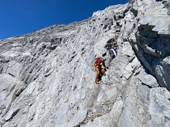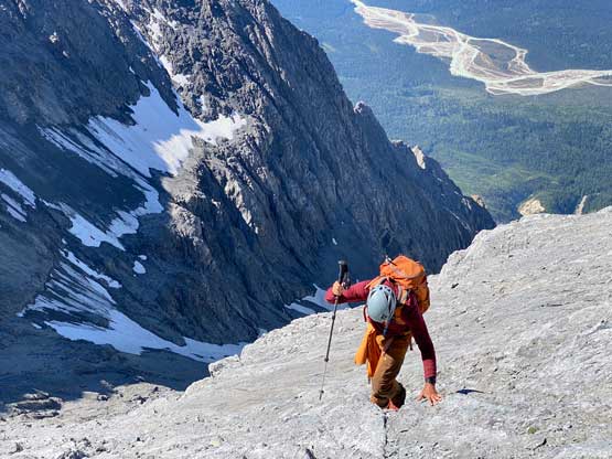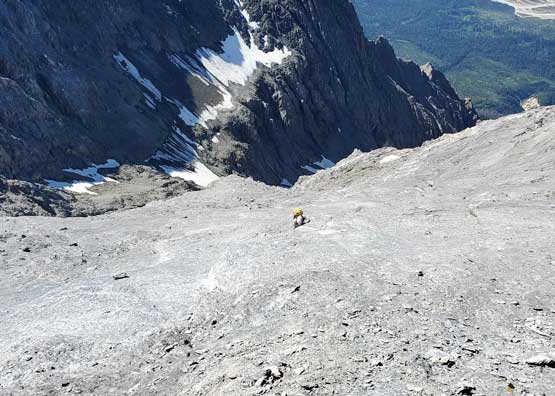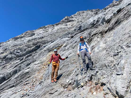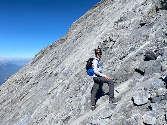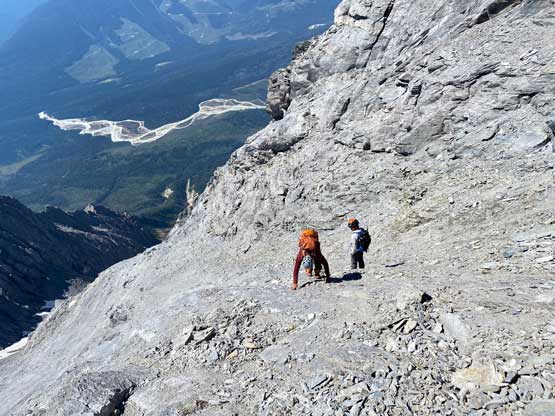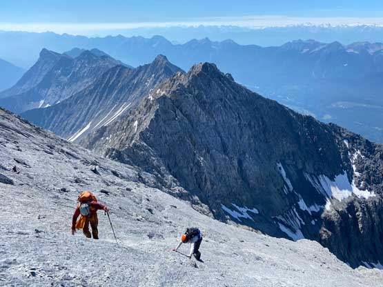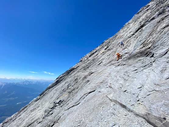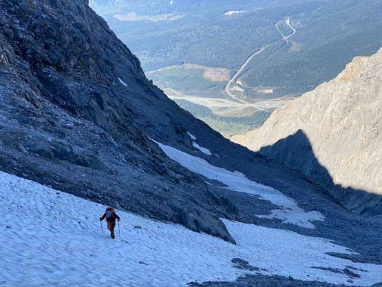 Despite the route-finding errors we opted to take our time on the summit as we were still doing great on time (as we nailed the route-finding on the entire lower mountain). I also enjoy reading registers that illustrate the who-is-who of a local community and this peak’s is certainly one. Eventually after 40 minutes on the summit we decided to face the descent. I was not too concerned as I was sure that one way or another we could make it down. I ended up being too optimistic again.. Pretty soon we came to that slab section and my first theory was to stay higher (more skier’s left) but quickly abandoned the idea after seeing a blank section of slabs. In retrospect that might have been the best way but I could not tell while looking at the slabs. Instead, we down-climbed the line we took to below the sketchy spot in hope to traverse underneath that section. After a committing stretch of down-climbing what we saw was nothing, but smooth slabs. Carl ended up balancing across without any issue but Noah soon turned back to follow me, ascending at least a full pitch of 4th class slabs back up to the level of that aforementioned blank section and then down towards skier’s right we finally noticed one stretch of slabs that were more broken. We immediately committed to that and sure enough it was only 4th class. We should have down-climbed to exactly where Carl was waiting but instead, we traversed skier’s left a bit too soon and that became the second error we made on the descent. To correct this error Noah and I both down-climbed some sketchy 5.4 terrain but after that we thankfully had no more problems. At the bottom of the slabs Carl and I had to take another break to switch footwear back to boots and then I led us down-climbing the snow slopes back into the main valley. I did some boot-skiing lower down as I had stiffer mountaineering boots.
