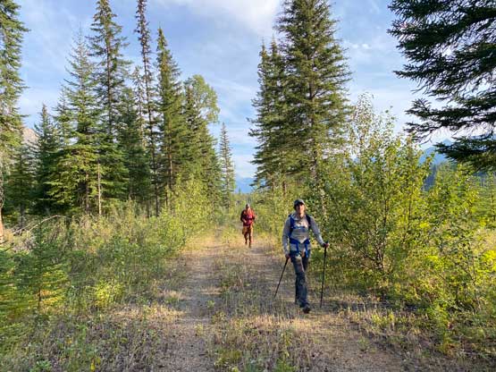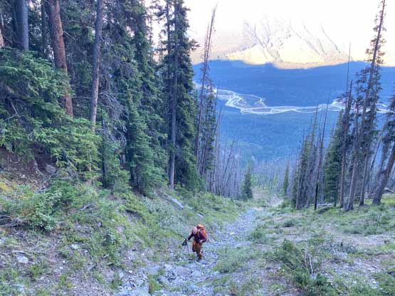 The previous evening I drove to Canmore after Mt. Stephen to properly prepare for Chancellor Peak’s climb. I could have driven back to Golden which was much closer, but I didn’t want to risk getting stuck at the highway closure again, and Canmore is the nearest town on the other direction that I felt comfortable with. I bought about 40 dollars worth of food and drink from Safeway (three bottles of Gatorade, three sandwiches, a bag of cheese with sausages and bunch of others), quickly repacked and drove back into Yoho. I made to Hoodoo campground at almost 11 pm and parked right in front of a locked gate. I had Anton’s GPS track and this parking spot was right on the track. There’s no cell reception and a few confusing side roads but I sent both of them the track so they should have no problem finding here. I opted to wear mountaineering boots while carrying rock shoes for the slabs near the summit and the rock shoes turned out to be essential for the mission. Noah was comfortable wearing approach shoes for the whole trip while Carl would do similar with me, but carrying approach shoes instead of rock shoes. The others showed up at 5:45 am and we managed to start at 6 am exactly as planned. This was right around the time when head-lamps were no longer needed.