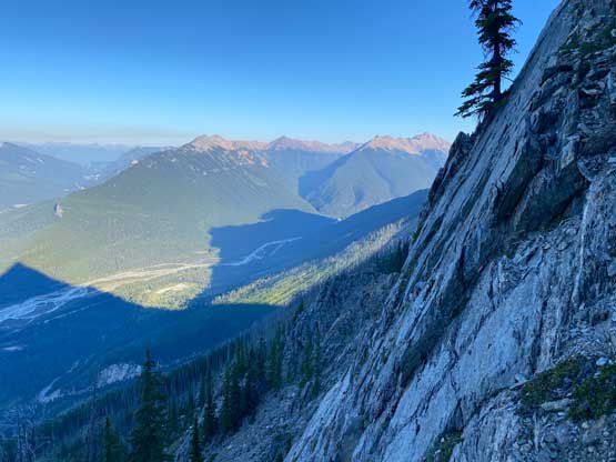 Anton had done a great job putting together a track that’s relatively free of bush but the track diverged on at least two occasions. I had asked him which branch of the track to recommend and he showed me the better way. With his beta we were able to nail this approach with under 10 minutes of bushwhacking overall. The plod across the clear-cut and then the swamp was definitely not aesthetic but I wouldn’t call that as “bushwhacking”. We just had to hop over some dead-falls that were no more than thigh high, and the swamp was not nearly as wet as we expected. There’s even a pretty well-defined path through the swamp. My pants were soaked from the dew but all of our boots were still dry after that section. On the far side of the swamp we briefly thrashed through a dense band of bush and then entered the open forest. Again, there were some dead-falls but nothing really annoying. We followed Anton’s descent track to the very bottom of a large drainage and easily rock-hopped up this drainage for a while. Once making sense we ascended a very steep and loose forested slope on climber’s left to escape the drainage onto a timbered ridge as we knew the earlier we could do this transition the better. We then instantly found the “animal trail that avoids 98% of the sticks” on this timbered ridge as mentioned in some other trip reports and indeed, we didn’t really have to deal with pick-up-sticks until the very end of this stretch, at least 600m higher up. The upper end of this ridge had some unavoidable dead-falls but like I said, the unpleasantness was no more than 10 minutes and that’s it. We then located a bush-free gully and grunted all the way to the base of the rock face ahead which marks the end of the approach and the start of the scramble. About 1000 m elevation had been dispatched by this point and we were under 2.5 hours into the trip.