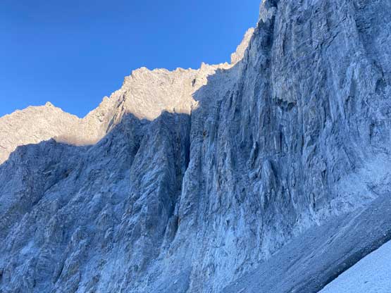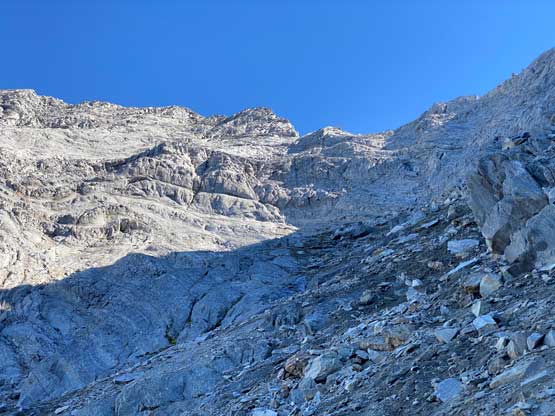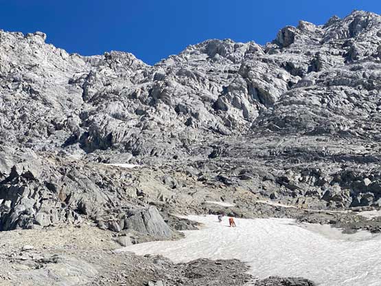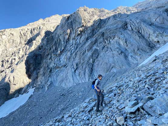 There’s a trickle of streams not far up from where we dropped into this main gully/valley so we loaded up the water bottles. I was not 100% about water sources higher up but in retrospect there were a much better source of water higher up, but we didn’t want to take a chance. We then took out the second poles and plodded up some scree and rubble to the first path of snow. Carl continued ascending the scree while Noah followed my lead ascending snow. I was the only one wearing mountaineering boots so snow was definitely my preference over scree. And then there came the “waterfall step” which would be the crux #2. Noah climbed a line closer to the water while Carl and I scrambled the most obvious break which turned out harder than expected. I was thinking maybe I would want the rock shoes for the down-climb later in the day but either way we all made our respective lines and both Noah and I would call this step “low class 5”. Mine could be 4th class if one really trusts the friction on this water-worn slabs. I couldn’t trust the friction that much, so did some harder moves. And for some of you wanting to bring a rope, there was no rappelling station above this step.