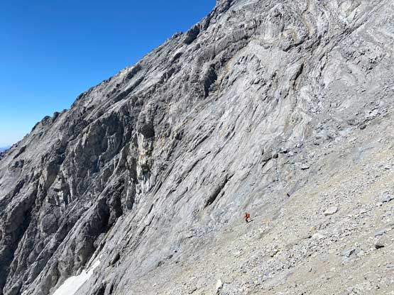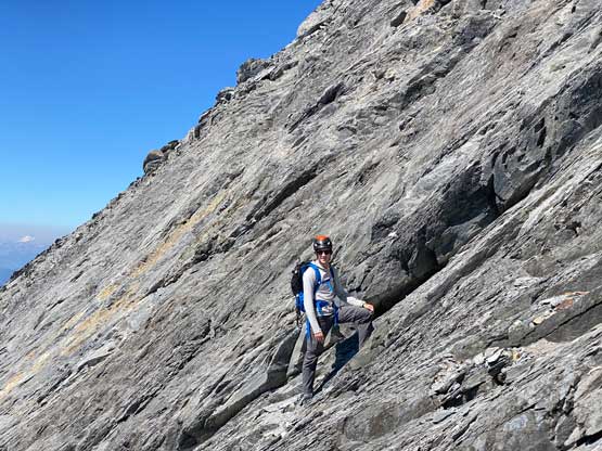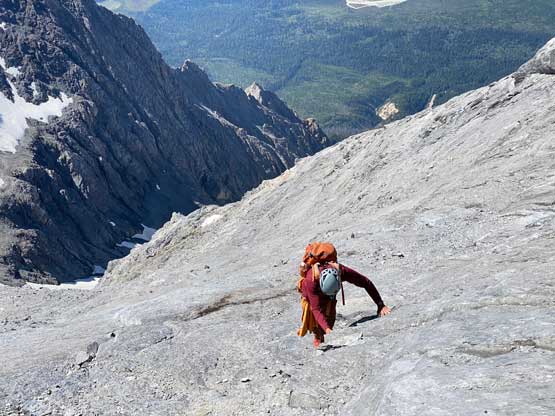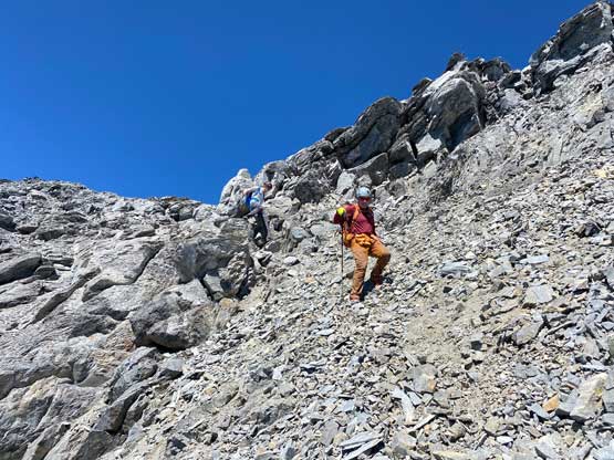 I had some beta that “climber’s right is harder” so we traversed across a few smooth slabs towards left instead, but later at home I also realized that some gorups actually went up and right to hit the ridge and that route didn’t seem to go too terribly. The line we took by staying low on climber’s left was the next level. At one point a cliff band forced us to ascending straight up and that quickly dumped us into 5th class terrain. We should have turned around to find an easier path, but we were being stubborn. I made the call to do a sketchy transition from boots to rock shoes and then led up a 5th class move and then we were committed to this line. But nearing the end it started to become really sketchy with nothing to hold onto. Noah and Carl climbed a pitch of slab corner that Noah rated “mid class 5” with a few irreversible moves to start with. I saw the lethal exposure of this whole section and couldn’t commit. Instead, after wasting at least 20 minutes trying to figure out another sequence I gave up, gingerly down-climbed the class 5 slabs that we just did, and climbed around farther to the left side on more low 5th terrain. The three of us then had to descend a bit to work around another band of rock before joining the two strips of orange rocks mentioned in the other trip reports. At least an hour was wasted here and we also must find a different, down-climbable route an hour or two later and that started to become a bit stressful. The rest of the ascent was not hard anymore, but still loose and exposed.