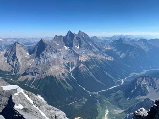 Fast forward to 2022 the trip started out with Mt. Stephen with Oakley on Wednesday but the weather forecast showed bomber conditions on both Wednesday and Thursday. I started to wonder maybe I would have enough energy to pull off Chancellor Peak as well, even though I knew doing two big days (2000m + 2300m elevation gain) back to back might not sound smart, but the weather window was here and I must take advantage of that. I recalled that during my Lunette Peak’s climb in 2020 Noah MacDonald talked to me a few times about doing Chancellor Peak so I sent him a message. Meanwhile I asked my friend Doug Lutz who is literally the central of Rockies scrambling community to recommend one or two top-notch Rockies scramblers and his first response was Carl Glaser. I had never hiked anything with Carl but I trusted Doug’s judgement, so I sent Carl an invite as well. To a bit of my surprise both of them were instantly “in” even though I sent the invites only a mere day ahead at the very last minute. The plan was then quickly formed to start at Hoodoo Creek campground at 6 am. Carl and Noah would carpool out of Calgary early in the morning while I would simply sleep in the car at the trail-head. I was quite excited about this trip as part of me wanted to compare Chancellor Peak with South Goodsir, the sketchiest 11,000er considered by most list finishers. I had a hypothesis that South Goodsir is just plainly dangerous but actually not too far beyond these scramblers’ scope of experience but to prove this hypothesis I must climb Chancellor and/or Robertson. Among these two I felt more excited about Chancellor Peak as this is overall a much-bigger mountain with a more iconic profile.