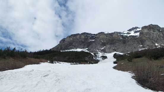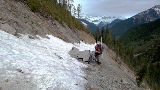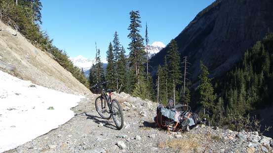 Sunday was overcast just as expected – which was perfect as we actually did not want the sun on this approach day. Biking uphill was quite a tough work and certainly not as fun as what others had advertised, partially because I’d never mountain biked before and I hadn’t been biking in town for almost 7 years already. All I still remember was how to bike, but my muscles had become super weak so that I pretty much couldn’t do any uphill even on the lowest gear, so I pushed my bike up. Ben also had to push for the most part. Around the corner and into the Rice Brook canyon we started to see snow and some huge boulders blocking the road. We pushed for another kilometer or so before ditching the bikes (which itself was quite a highlight for me on this particular day).. Continuing up on foot we soon passed the turn-off for Alexandra’s approach, and shortly after we arrived at the supposed crossing point for Rice Brook.