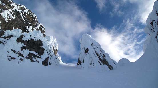 Unfortunately the forecast for the night did not come correct and when we woke up at 2:45 am we immediately had to realize our objective was soaked in clouds and there’s no freeze at all. Oh well, we decided to go anyway hoping the conditions would improve higher up. For the least we’d make some tracks for Tuesday as a second shot if things got worse. From my summer pictures taken from Alexandra we knew there were quite a lot of crevasses on this glacier, but they were all well-bridged in May. We followed the faint tracks left by Trevor S & Trevor D and got to the base of that gigantic S. Couloir with no incidence. Apparently there had been some massive avalanches in the past few days as Trevor’s tracks were completely buried by microwave-to-car sized debris at sections. The snow got harder as expected once we started the couloir so we ditched skis/snowshoes soon. The weather also started to improve with a clearing trend coming in from Alberta side so our mood suddenly got boosted up. Upwards and onwards the condition changed from post-holing to step-kicking and eventually to front-pointing. Ice tool out and we got to enjoy some fun snow climbing. After grinding 600 vertical meters up we went climber’s left of the obvious gendarme.